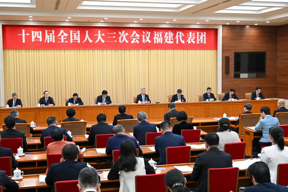 3月5日下午,中共中央政治局常委、中央纪委书记李希来到他所在的福建代表团,同代表们一起审议政府工作报告。 新华社记者 张领 摄